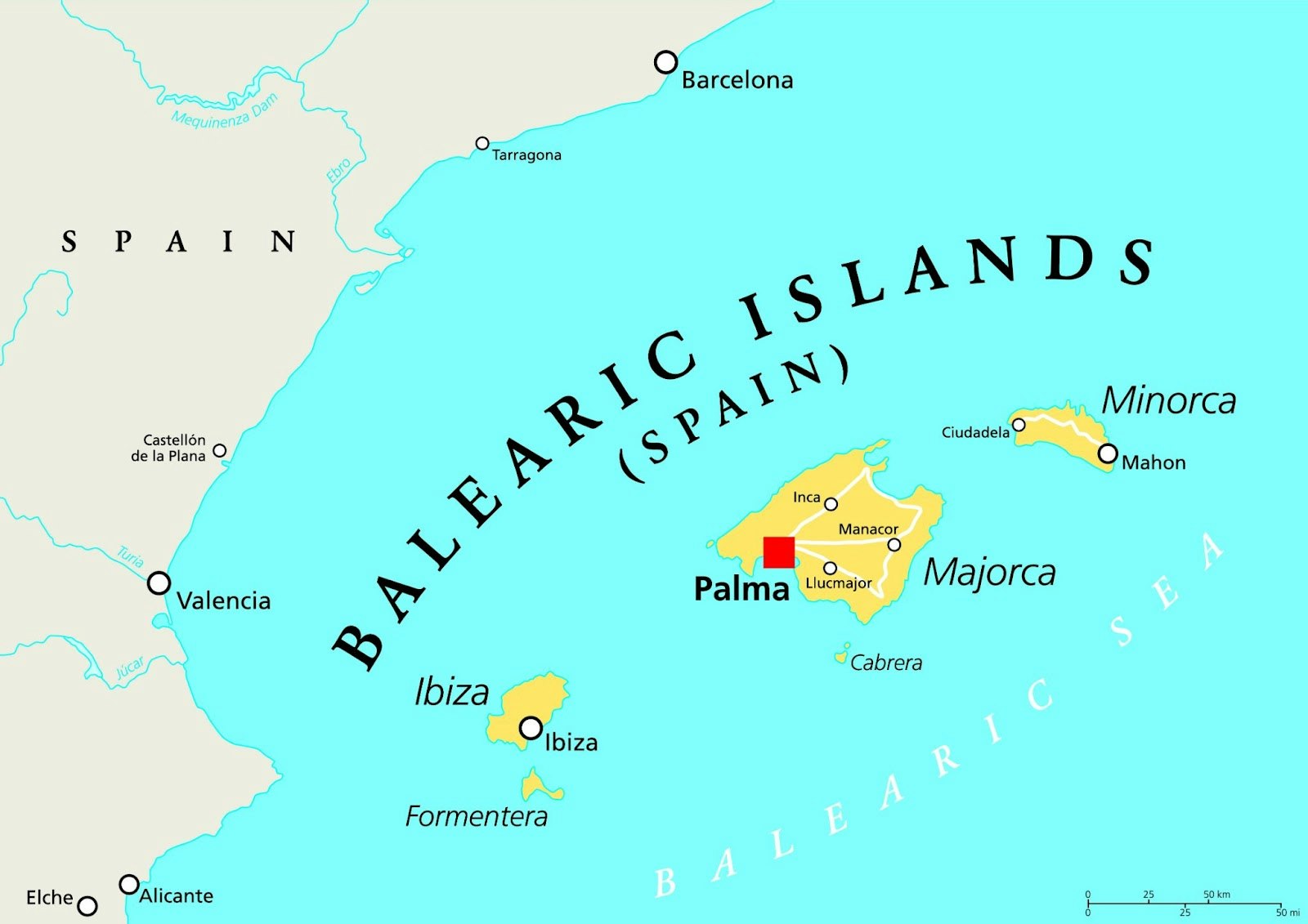 Die vier Hauptinseln der Balearen sind Mallorca, Menorca, Ibiza und Formentera. Eine Besonderheit bietet die Insel Cabrera wegen ihres Nationalparks.
