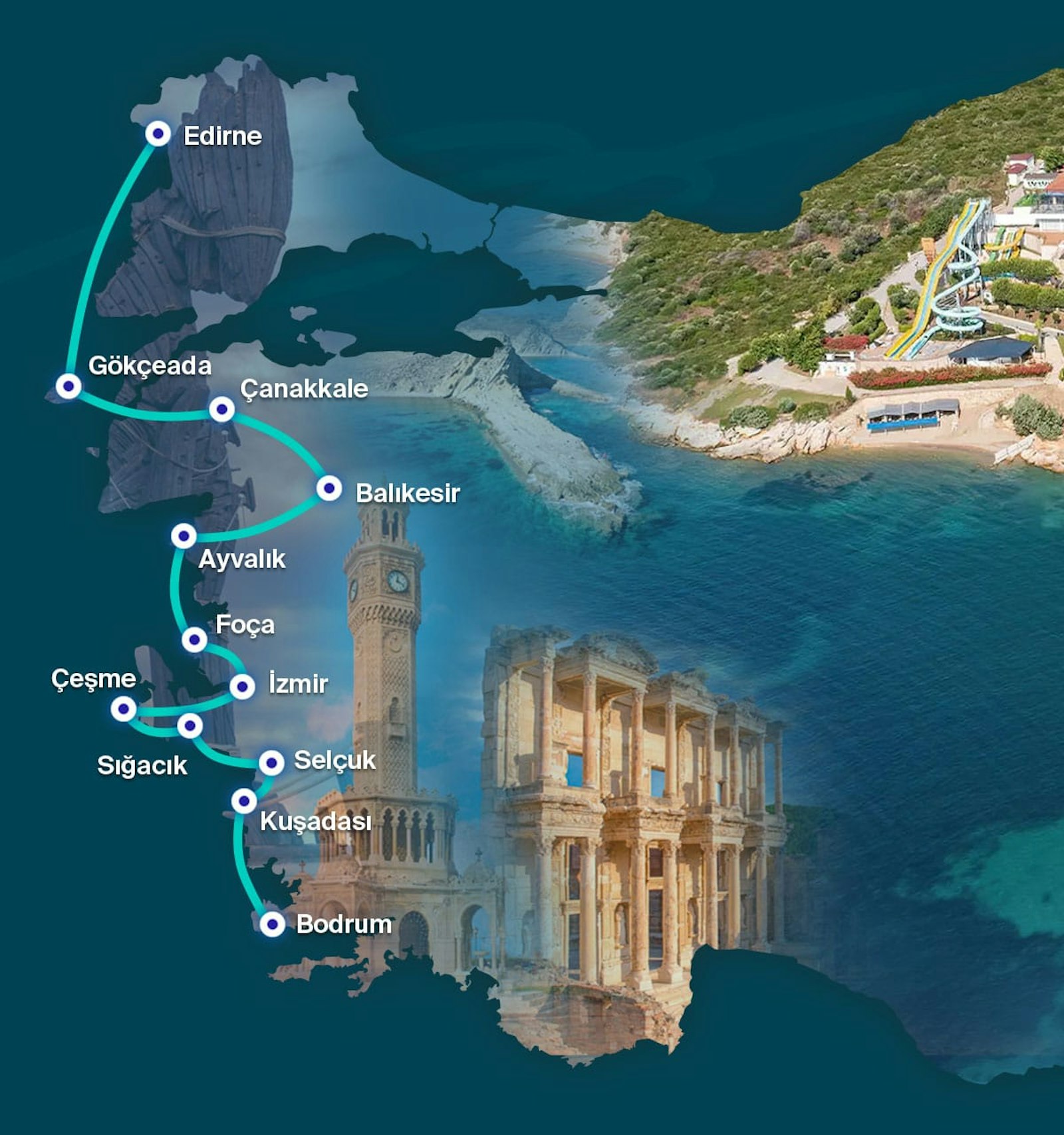Der erste Roadtrip beginnt im türkischen Thrakien, folgt der Westküste von einem Ende zum anderen, führt Sie zu den schönen Küstenstädten der Ägäisregion und schließlich nach Bodrum, der Perle der Ägäis.