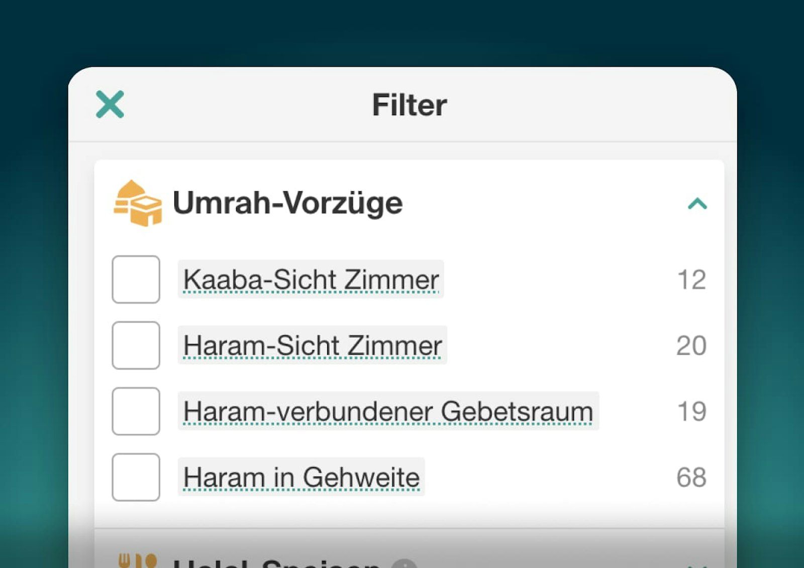 Offensichtlich gibt es in den heiligen Städten keine Hotels, die Alkohol ausschenken, und alle bieten ausschließlich Halal-Speisen an, aber Sie werden die Halal-Filter dennoch nützlich finden, um die Verfügbarkeit von Freizeiteinrichtungen wie Spas oder Pools anzuzeigen, die nur für Männer oder nur für Frauen verfügbar sind oder privat mietbar sind.