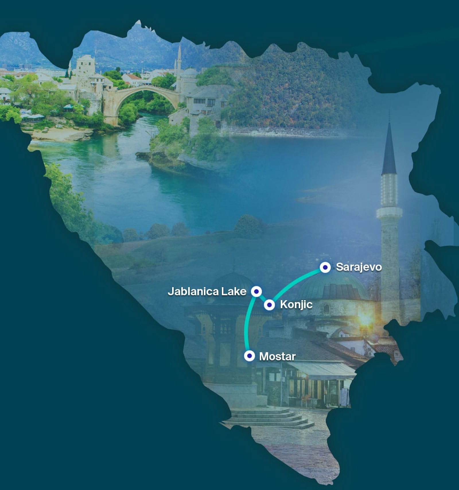 From Lake Jablanica, you will reach the historic city of Mostar after a 1-hour drive on the E73/M17.