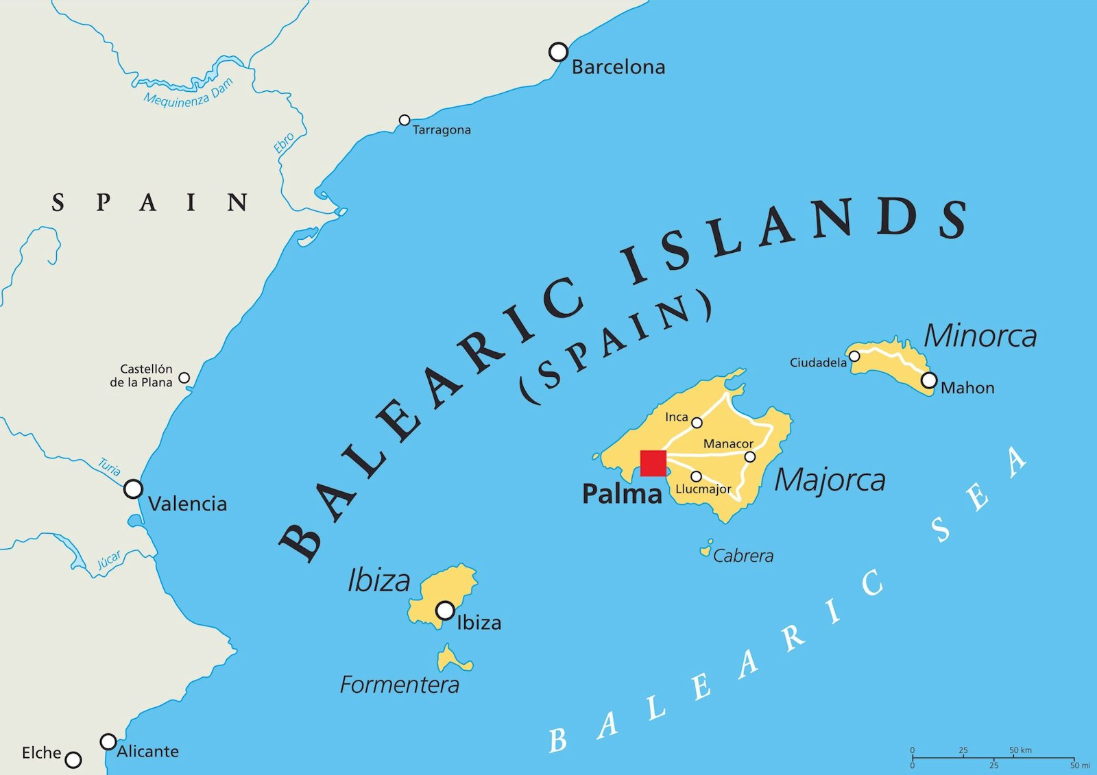 Les quatre îles principales des Baléares sont Majorque, Minorque, Ibiza et Formentera. L'île de Cabrera offre une particularité régionale en raison de son parc national.