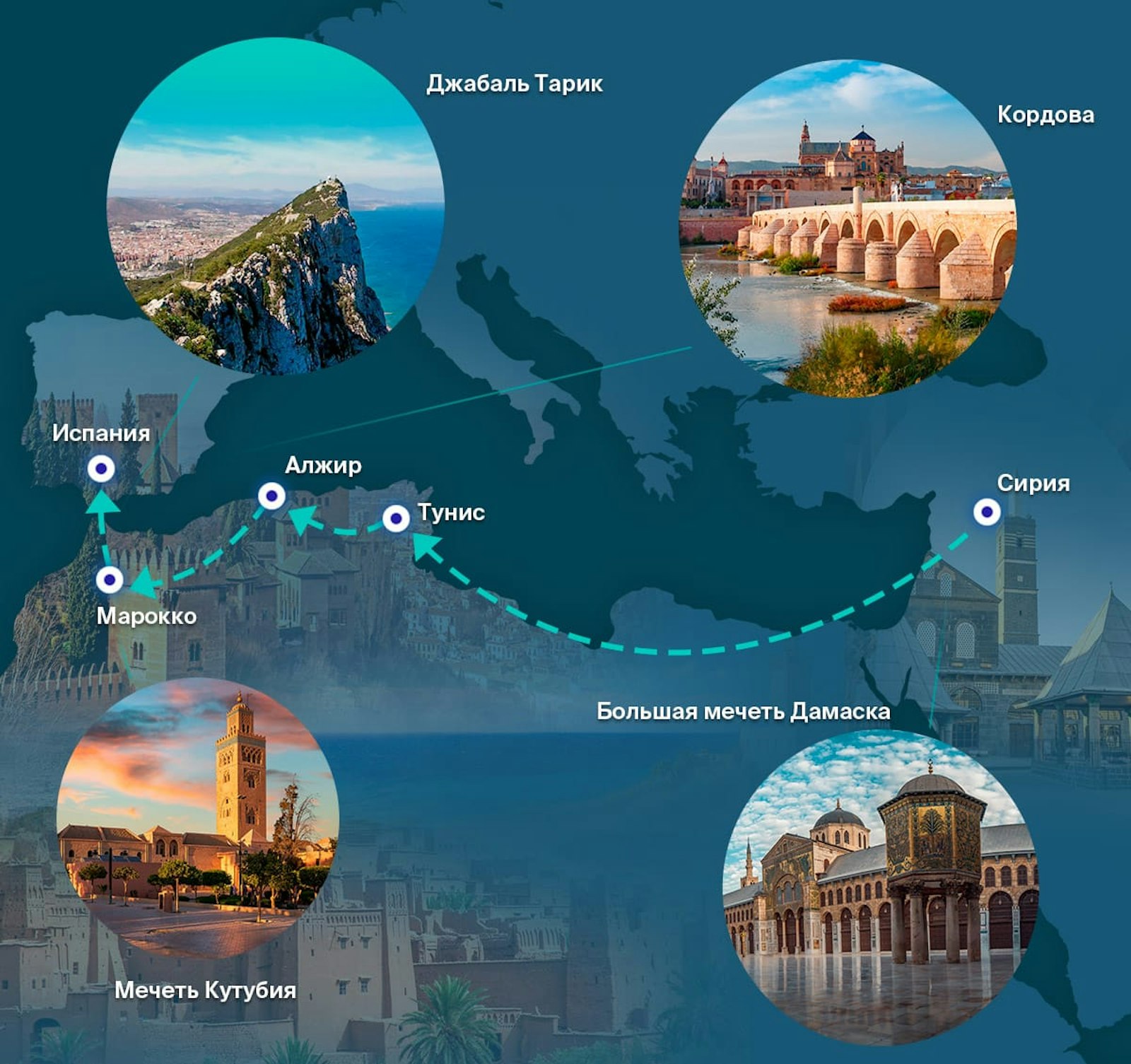 Путь Омейядского халифата из Сирии в Испанию является ярким примером преобразующей силы ислама, распространившего веру, знания и культуру на обширные территории. От доблести Тарика ибн Зияда до расцвета золотого века Аль-Андалуса наследие халифата продолжает вдохновлять через его архитектурные чудеса. Эти вечные символы исламского наследия не только отражают глубокую мудрость и красоту веры, но и служат свидетельством прочной связи между Востоком и Западом, основанной на стремлении к знанию, гармонии и духовному просветлению.